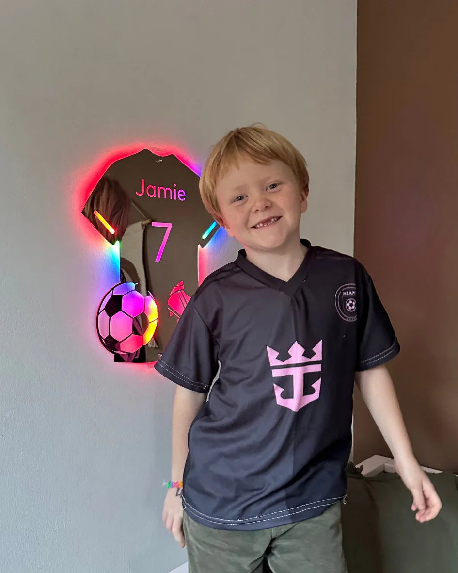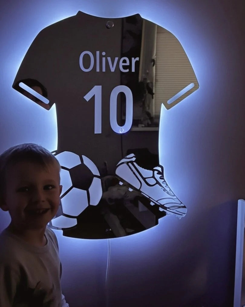 Offert à mon fils pour son anniversaire, il était trop content de voir son prénom et son numéro sur le maillot. Le rendu est encore plus beau en vrai et il l’allume tous les soirs avant de dormir.